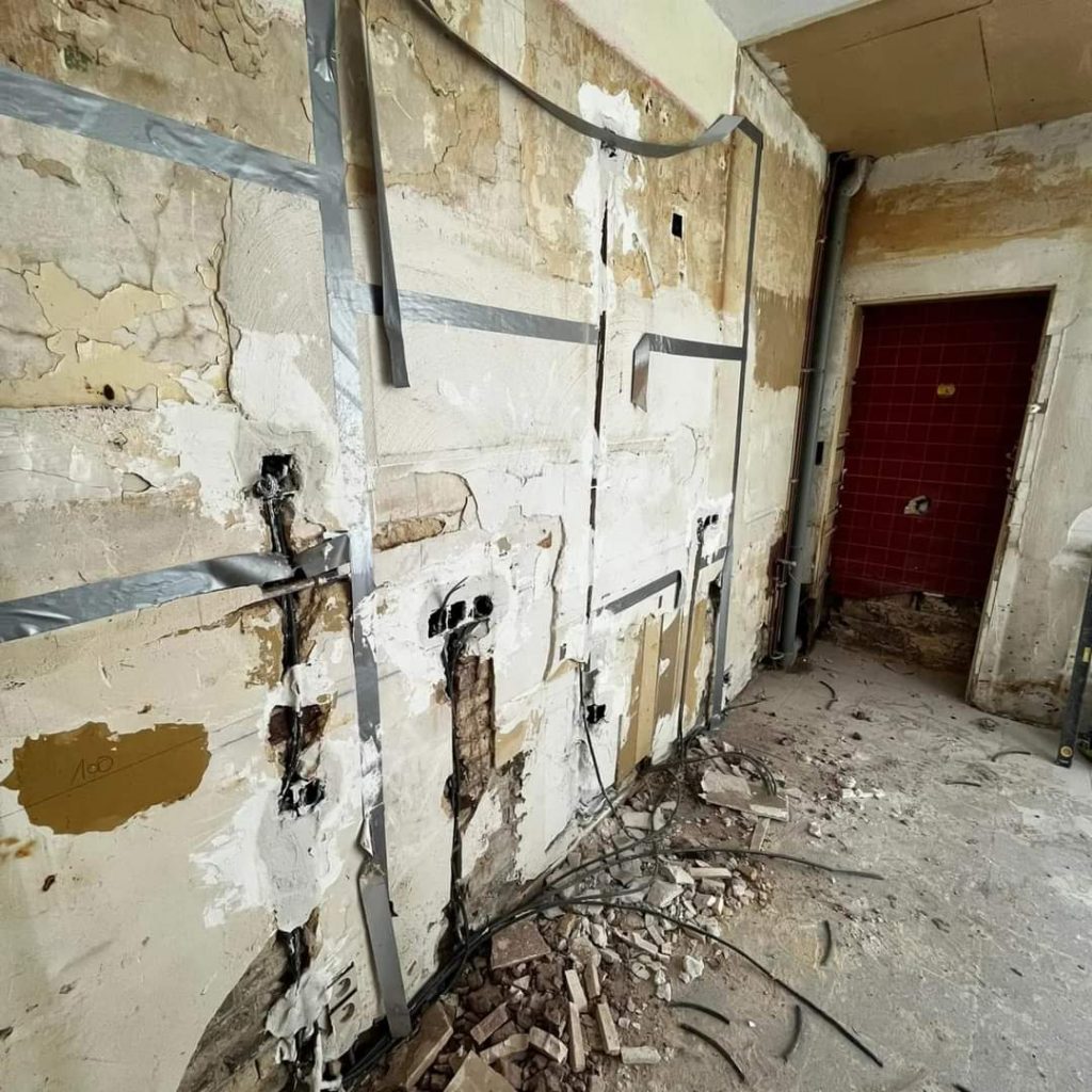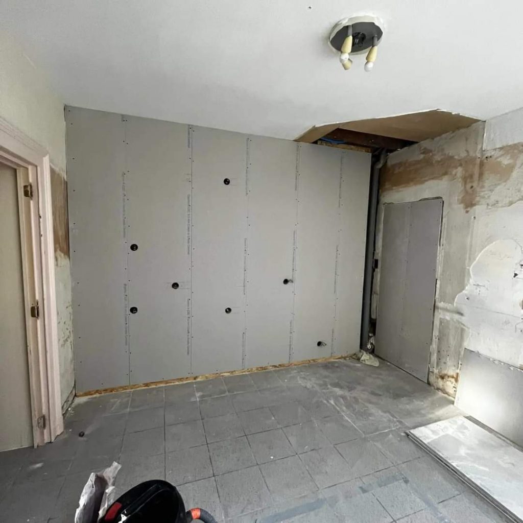 Photo avant: le client venait d’acheter une maison et devait installer sa cuisine. En démontant l’ancienne, il fait face à une mauvaise surprise, le mur vient avec… Nous intervenons donc en urgence.