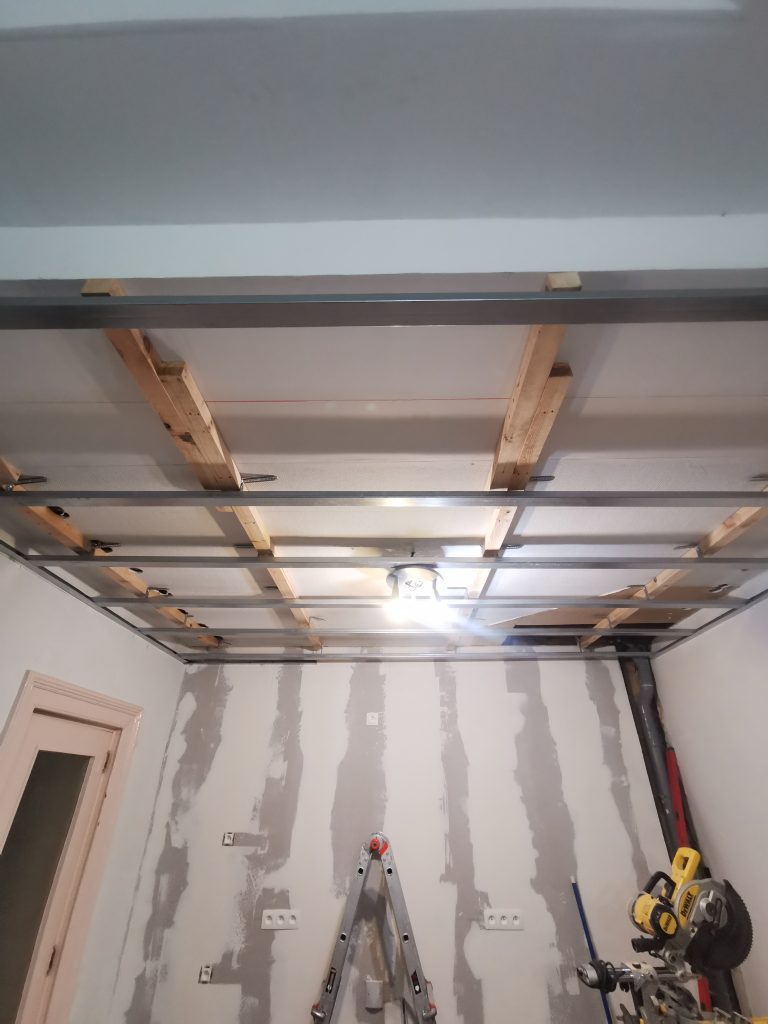 Le client étant très content et l’ancien plafond étant très abîmé, totalement hors niveau et recouvert de fibre de verre, nous nous lançons dans la réalisation d’un plafond suspendu… De niveau !