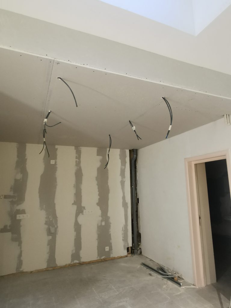 Et voici donc une belle cloison, un beau mur et un superbe plafond qui changent totalement la pièce et l’apprêtent à accueillir une belle cuisine. Ce n’était pas gagné, surtout au vu des délais imposés mais nous y sommes arrivés.