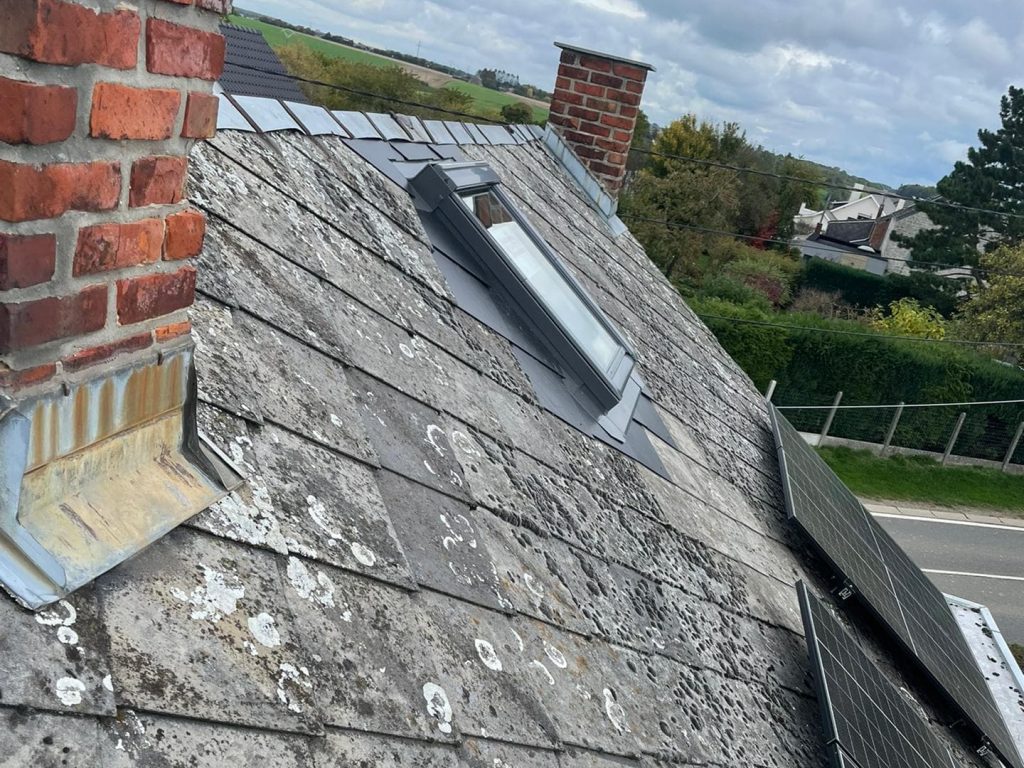 Fermeture de deux tabatières et placement de Velux. Nous avons utilisé les anciennes ardoises pour reboucher les tabatières afin d’obtenir un résultat homogène.